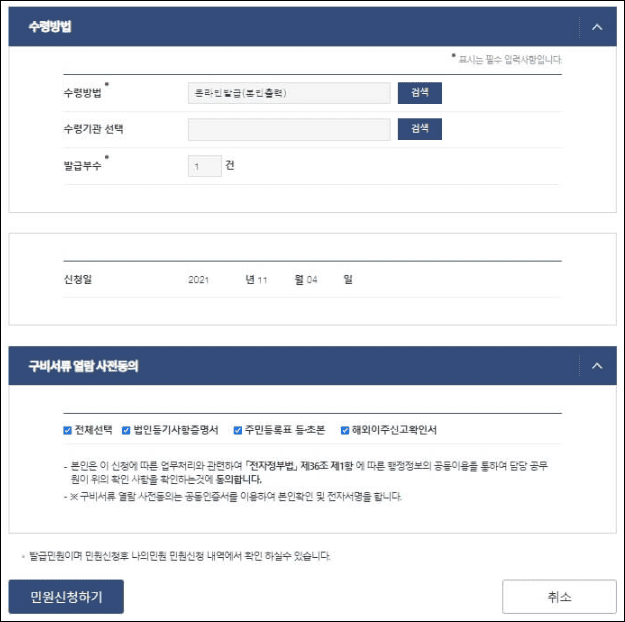 수령방법과 수령기관을 선택하신 후, 구비서류 열람 사전동의를 모두 선택 해주신 후에 민원 신청하기 버튼을 눌러주세요.