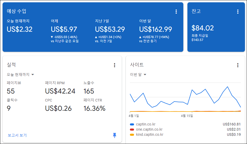 캡틴소 블로그 애드센스 수익 현황