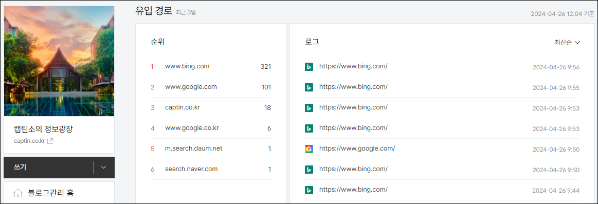 아래는 오늘 오전에 찍어본 캡틴소 블로그 유입경로 현황 입니다. 빙이 1등이고, 구글이 2등인 상황이며, 3일단 다음에서는 1의 조회수만 있는것이 보이네요.
