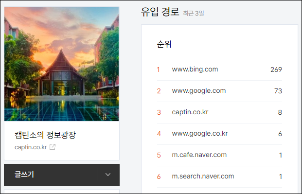 위의 그림은 티스토리 최근 3일간 접속자를 볼 수 있는 관리창입니다. 보시다시피 모두 빙과 구글에서 들어오는 유입이고, 네이버는 딱 한건 있네요. 그리고 다음은.. 무려 0건의 노출을 보여주고 있습니다.
