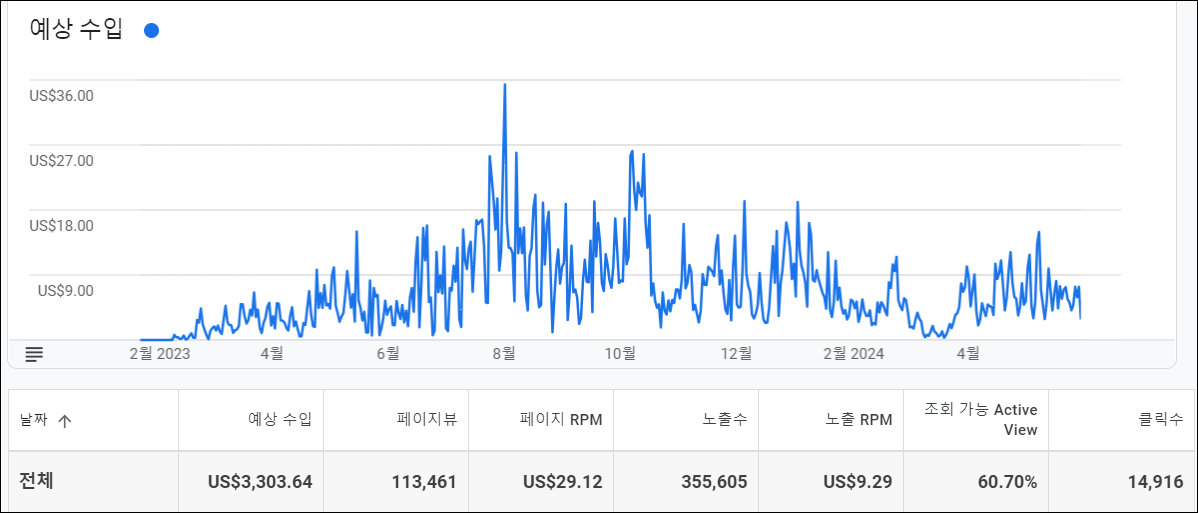 어찌 되었건 해당 블로그는 작년 2월경에 처음 시작하였고, 수익 블로그가 아닌데도 불구하고, 총 아래와 같이 3,300달러의 수익을 얻을 수 있었습니다. 오늘자 환율료 계산하면, 약 450만 원의 수익이 되겠네요.