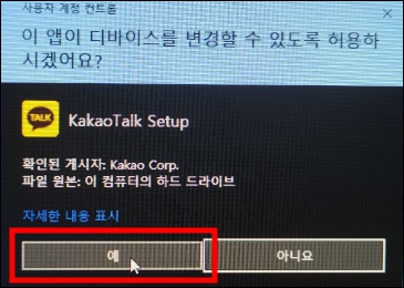카카오톡 설치는 아래와 같이 진행됩니다. 아래의 창이 나오면 예를 눌러 설치를 진행해 주세요.